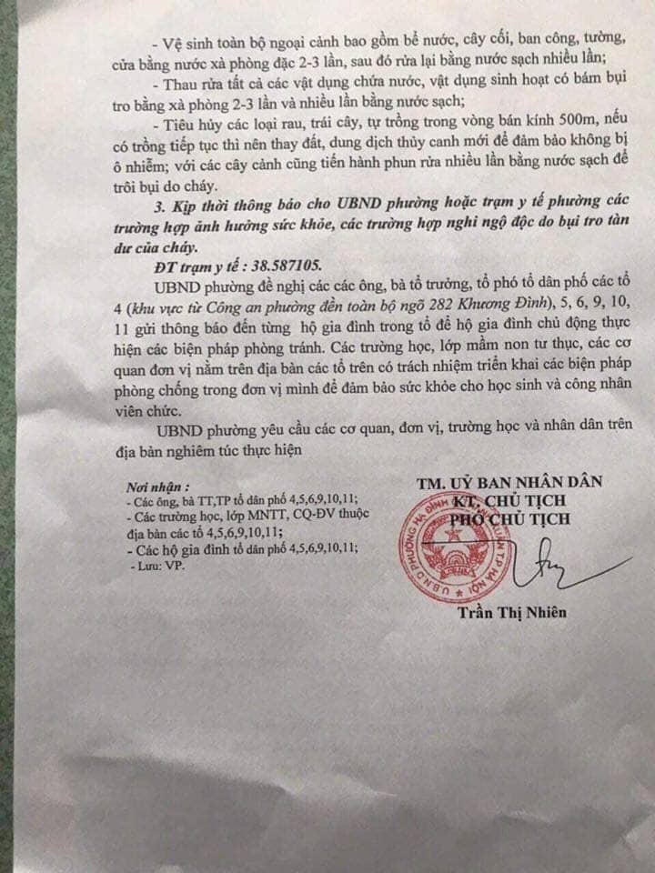 Theo vị này, UBND phường Hạ Đình đã thu hồi văn bản thông báo khuyến nghị người dân không sử dụng thực phẩm, nước trong bán kính 1 km tính từ Công ty cồ phần bóng đèn phích nước Rạng Đông, bởi văn bản này được ban hành không đúng nội dung và thẩm quyền.