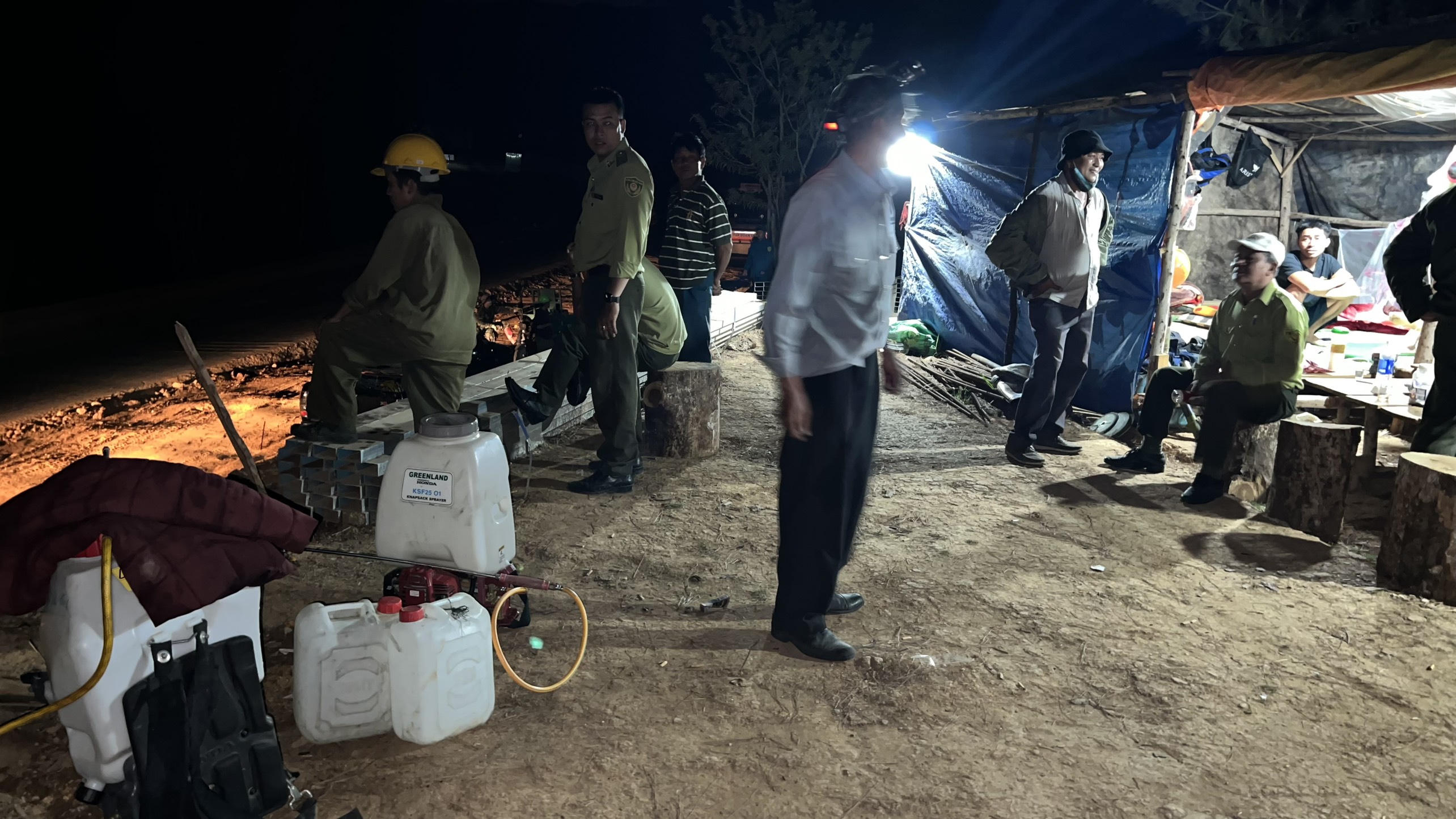 Lực lượng chức năng túc trực tại hiện trường vụ cháy rừng đêm 7/4. |