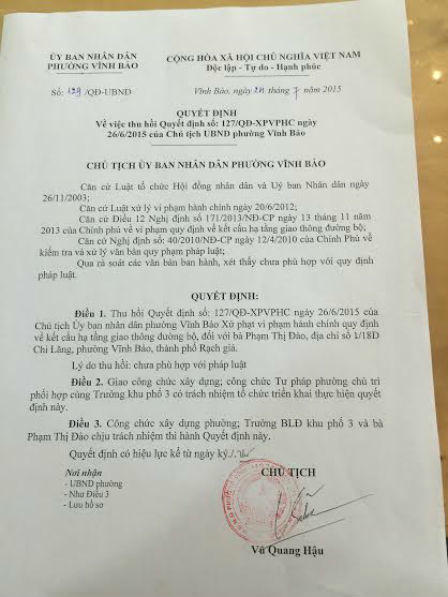 Sau khi bài báo được đăng tải, ngày 24/7/2015, ông Vũ Quang Hậu, Chủ tịch UBND phường Vĩnh Bảo, TP. Rạch Giá ban hành Quyết định số 129/QĐ-UB (Quyết định số 129) thu hồi Quyết định số 127 do chính ông Hậu ký, lý do thu hồi là “Chưa phù hợp với quy định về pháp luật”. Để triển khai Quyết định số 129, cùng ngày 24/7, UBND phường Vĩnh Bảo tổ chức một đoàn gồm: cán bộ tư pháp, xây dựng, trật tự đô thị, đại diện tổ dân phố.