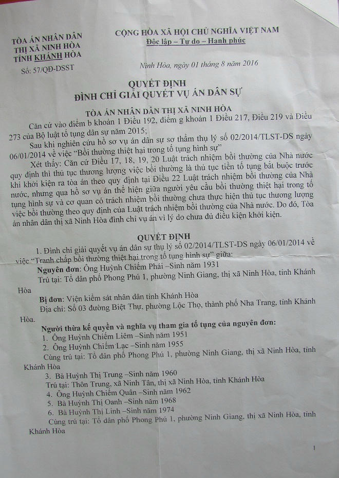 Ngày 6/1/2014, TAND thị xã Ninh Hòa đã thụ lý đơn yêu cầu “Bồi thường thiệt hại trong tố tụng hình sự” của ông Hoạnh. Tuy nhiên, hơn 2 năm sau, tức ngày 1/8/2016, tòa này lại ra quyết định số 57/QĐ-DSST để đình chỉ giải quyết vụ việc nói trên.