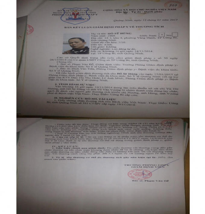 Ngày 31/5/2017, Trung tâm giám định pháp y đã có công văn trả lời cho Cơ quan điều tra Công an Thành phố Uông Bí với nội dung đầy bất ngờ: “Bản kết luận giám định thương tích của ông Hùng, bà Hương, ông Vương đã có từ ngày 13/1/2015” với tỷ lệ thương tích là: ông Hùng 36%; ông Vương 9%; bà Hương 0%.