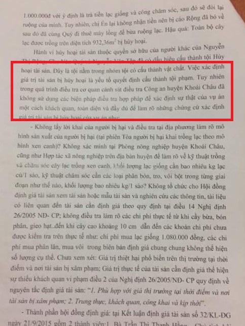 Cụ thể: “… trong quá trình điều tra, cơ quan CSĐT Công an (CA) huyện Khoái Châu đã không sử dụng các biện pháp điều tra hợp pháp để xác định sự thật của vụ án một cách khách quan, toàn diện và đầy đủ để làm rõ những chứng cứ xác định giá trị tài sản bị hủy hoại của vụ án như:
