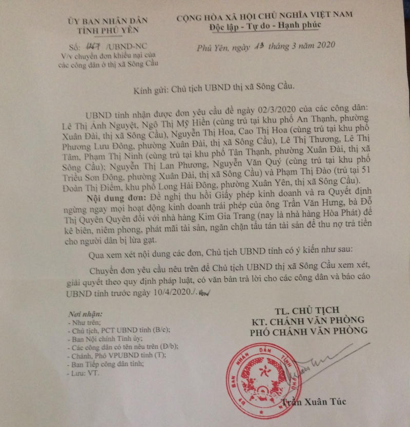 Theo những nạn nhân, ngày 28/5/2019, TAND Cấp cao tại Đà Nẵng ra quyết định giám đốc thẩm, tuyên hủy quyết định công nhận vợ chồng ông Trần Văn Hưng – Nguyễn Đỗ Quyên Quyên (người mua lại tài sản của ông Dũng – bà Trang) toàn quyền quản lý, sử dụng và sở hữu nhà hàng Kim Gia Trang theo hiện trạng diện tích xây dựng hơn 960m2 gắn trên tổng diện tích hơn 1.975m2 thuộc một phần thửa đất rộng gần 2.500m2 của vợ chồng ông Dũng – bà Trang. Ngay sau đó, họ đã làm đơn gửi đến Phòng Tài chính - Kế hoạch Sông Cầu (TC-KH) “yêu cầu trả lời cấp giấy phép đăng ký kinh doanh của nhà hàng Kim Gia Trang (nay đổi tên là Hòa Phát) có đúng hay không?”.