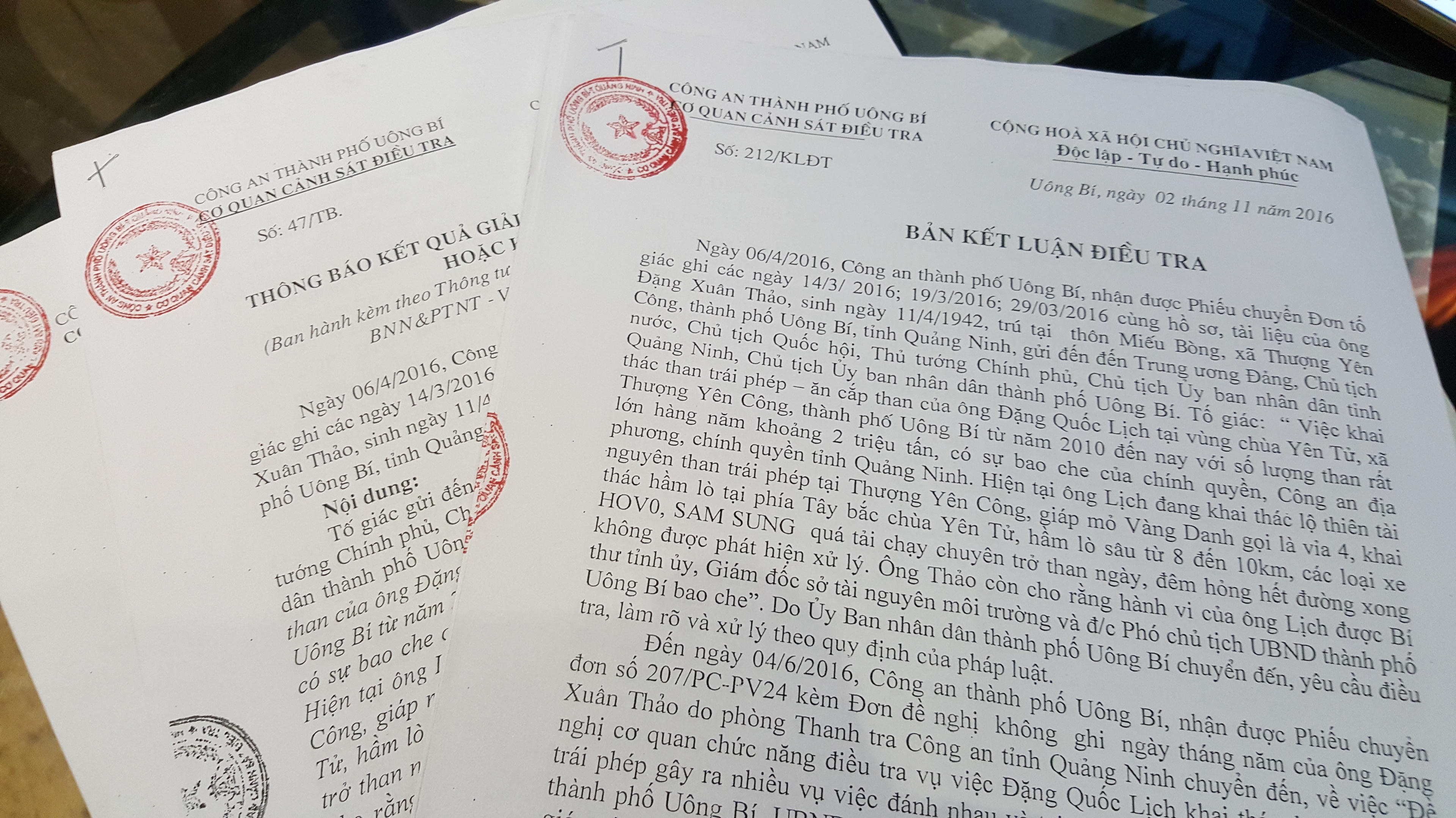 Cũng liên quan đến nội dung tố cáo này, Cơ quan CSĐT TP Uông Bí đã tiến hành xác minh, điều tra đối với các tổ chức, cá nhân và các địa bàn liên quan. Xác minh tại Ban quản lý Yên Tử, Công an xã Thượng Yên Công, Công ty than Nam Mẫu (khu vực Vỉa 4, Than Thùng… xã Thượng Yên Công TP Uông Bí), tiến hành kiểm tra thực tế tại khai trường phía Tây Than Thùng giáp với phía Đông rừng đặc dụng quốc gia Yên Tử. Kết quả chưa phát hiện vi phạm về khai thác, vận chuyển tài nguyên trái phép. Xác minh, kiểm tra tại khai trường khoảnh 2, Tiểu khu 9b, phía Tây rừng quốc gia Yên Tử (khe Cam) thuộc xã Thượng Yên Công, TP Uông Bí, tỉnh Quảng Ninh, kết quả có phát hiện dấu vết, đào, bới, khai thác than và một cửa lò khai thác than trái phép bị san lấp dấu vết cũ (khu vực này, vào ngày 27/01/2015, Công an TP Uông Bí phối hợp với Phòng CSĐTTP về quản lý kinh tế và chức vụ Công an tỉnh Quảng Ninh, bắt giữ, khởi tố điều tra ổ nhóm 20 đối tượng tội vi phạm quy định về khai thác tài nguyên do Nguyễn Thị Mai cầm đầu (Vụ án hình sự trên đã xét xử tại Tòa án nhân dân tỉnh Quảng Ninh).