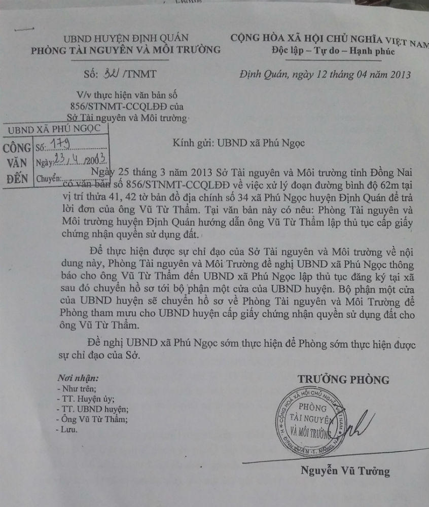 Cụ thể, sau khi nhận được văn bản đề nghị cấp sổ đỏ cho ông Thẩm, ngày 12-4-2014, ông Nguyễn Vũ Tưởng lúc này là Trưởng phòng Tài nguyên môi trường huyện Định Quán đã ký văn bản gửi UBND xã Phú Ngọc lập thủ tục đăng ký tại xã sau đó chuyển hồ sơ tới bộ phận một cửa của UBND huyện. Bộ phận của UBND huyện sẽ chuyển hồ sơ về Phòng Tài nguyên và Môi trường huyện để Phòng tham mưu cho UBND huyện cấp giấy chứng nhận quyền sử dụng đất cho ông Vũ Từ Thẩm. Ông Tưởng cũng đề nghị UBND xã Phú Ngọc sớm thực hiện để Phòng sớm thực hiện được sự chỉ đạo của Sở. Thế nhưng không hiểu sao từ đó đến nay ông Thẩm vẫn không được cấp sổ.