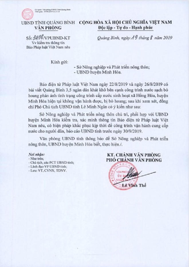 Theo văn bản, Phó Chủ tịch UBND tỉnh giao Sở NN&PTNT chủ trì, phối hợp UBND huyện Minh Hóa kiểm tra, xác minh thông tin Báo PLVN nêu; có biện pháp khắc phục kịp thời để công trình vận hành cung cấp nước cho người dân, báo cáo UBND tỉnh trước ngày 30/9/2019.