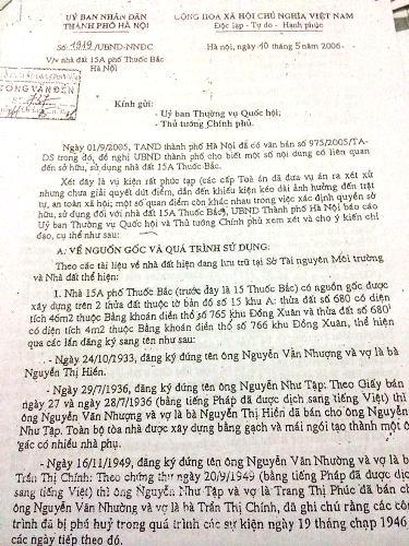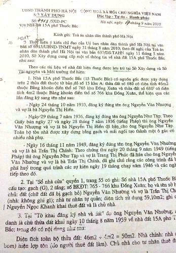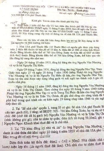 Các văn bản này của UBND TP. Hà Nội và sở ngành chức năng cũng khẳng định: “Nhà số 15A phố Thuốc Bắc thực tế không có hồ sơ hay danh sách, tài liệu nào thể hiện Nhà nước đã quản lý theo chính sách cải tạo nhà cửa, nhà vắng chủ, nhà công tư hợp doanh hay quản lý đất theo Thông tư số 73/TTg và Thông tư số 10/TTg của Thủ tướng Chính phủ. Do vậy Nhà nước không quản lý (không có văn bản quản lý) nhà đất tại 15A phố Thuốc Bắc và thực tế cũng không bố trí cho ai sử dụng nhà đất này trong quá trình thực hiện chính sách vầ nhà đất trước đây”.