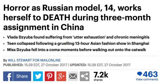 (PLO) -Đêm 25/10/2017, cô người mẫu xinh đẹp 14 tuổi đến từ Nga Vlada Dzyuba sau buổi trình diễn thời trang trở về nơi ở, cảm thấy trong người khó ở nên được các đồng nghiệp đưa đến bệnh viện cấp cứu nhưng đến sáng ngày 27/10 thì không qua khỏi...