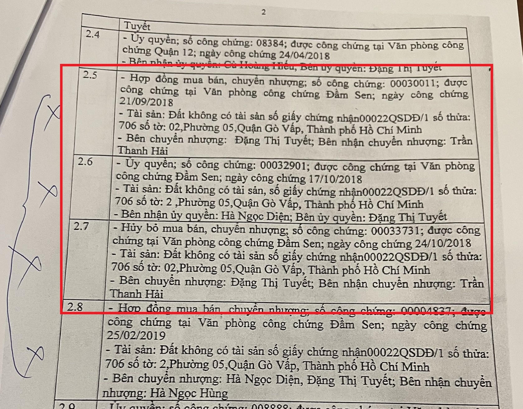 Với hồ sơ pháp lý liên quan thửa đất 706, ngày 4/11/2022, trả lời Cơ quan CSĐT Công an TP HCM, Trung tâm Thông tin & Tư vấn công chứng (Sở Tư pháp TP) cho biết ngày 21/9/2018, VPCC Đầm Sen công chứng hợp đồng mua bán từ bà Tuyết sang cho ông Hải. Ngày 17/10/2018, chính VPCC Đầm Sen cũng thực hiện công chứng ủy quyền từ bà Tuyết sang cho ông Hà Ngọc Diện (đây là hợp đồng ủy quyền mà ông Thức và ông Khánh thực hiện không đúng quy định về công chứng dẫn đến chữ ký, dấu vân tay không phải của bà Tuyết). Sau đó đến ngày 24/10/2018, VPCC Đầm Sen công chứng hủy hợp đồng mua bán giữa bà Tuyết và ông Hải.