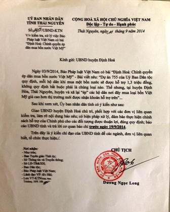 (PLO) - Ngay sau khi Báo PLVN đăng tải thông tin phản ánh việc UBND các xã và huyện Định Hóa “ép” người dân nơi đây phải mua bồn nước Việt Mỹ, Chủ tịch Tỉnh UBND Tỉnh Thái Nguyên đã có văn bản yêu cầu UBND huyện Định Hóa kiểm tra, xử lý sự việc mà Báo đã nêu, báo cáo UBND Tỉnh và trả lời báo PLVN trước ngày 19/9/2014.