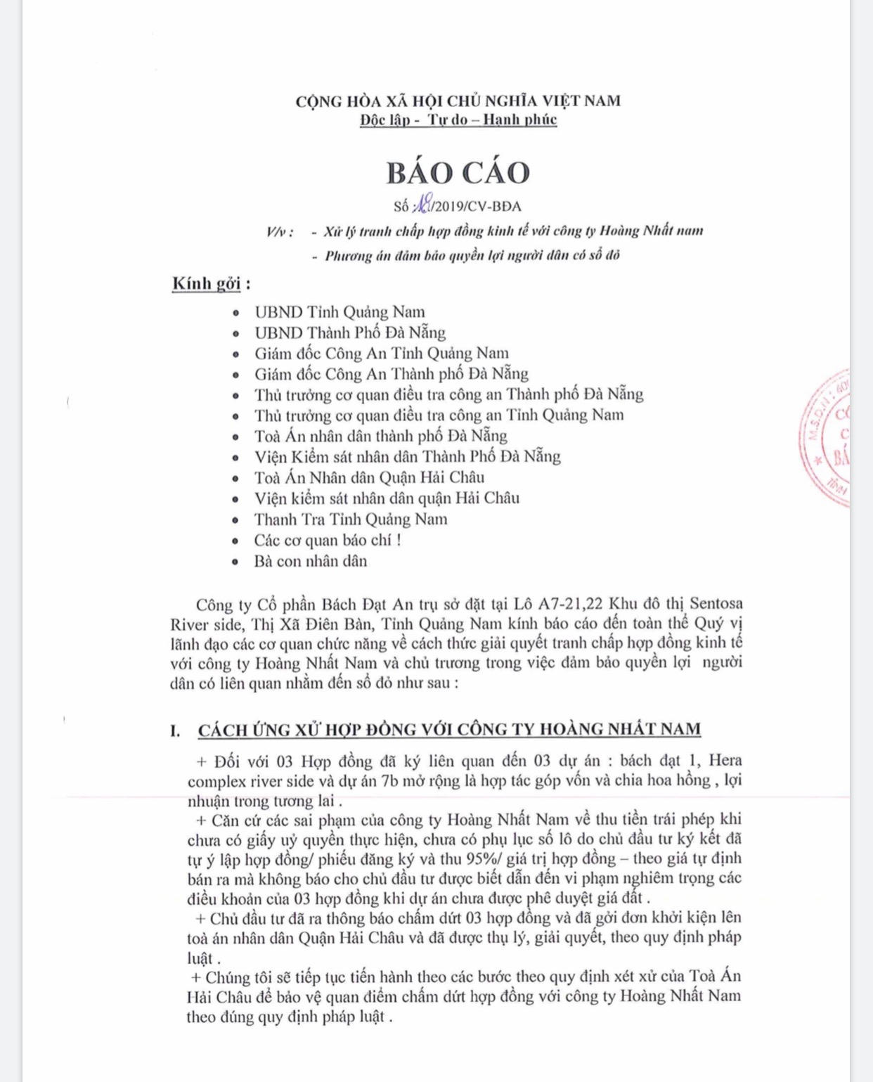 (PLVN) - Ngày 19/3, cơ quan chức năng tỉnh Quảng Nam và TP Đà Nẵng tiếp nhận báo cáo của bà Võ Thị Diệp, Tổng Giám đốc Công ty CP Bách Đạt An (trụ sở tại Quảng Nam) gửi để thông tin về vụ việc liên quan đến tranh chấp hợp đồng kinh tế với Công ty Dịch vụ bất động sản Hoàng Nhất Nam mà vừa qua khách hàng bao vây trụ sở hai công ty này để đòi sổ đỏ.