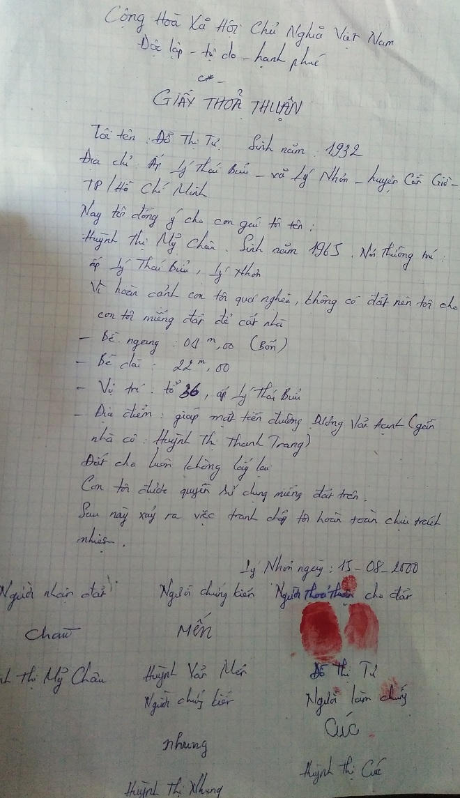 Hai bên ra xã, có nhiều người làm chứng, có địa chính xã, mẹ tôi thừa nhận đất là của ông bà nội cho tôi nên địa chính mới lập hồ sơ làm GCNQSDĐ. Đến năm 2005, tôi có được giấy chứng nhận”.