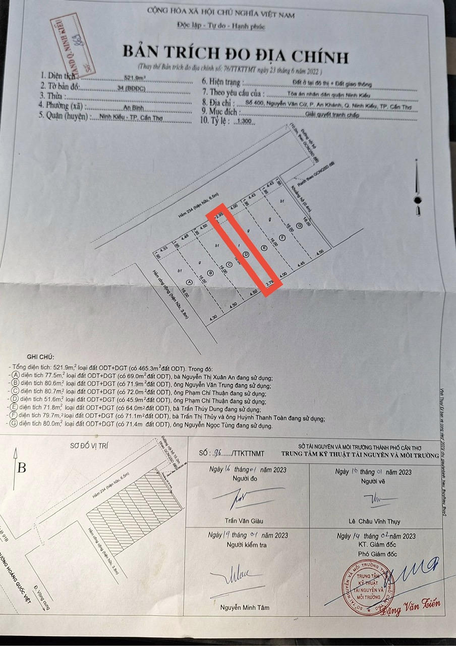 Theo hồ sơ cấp “sổ đỏ” năm 2005 và bản đồ năm 2009 thì từ thửa 1071 đến thửa 389, chiều ngang 36m. Tuy nhiên, theo đo vẽ ngày 16/1/2023 thì chiều ngang chỉ còn 34,2m, thiếu 1,8m. Chiều ngang các lô cũng không đúng như bản vẽ năm 2005 và 2009.