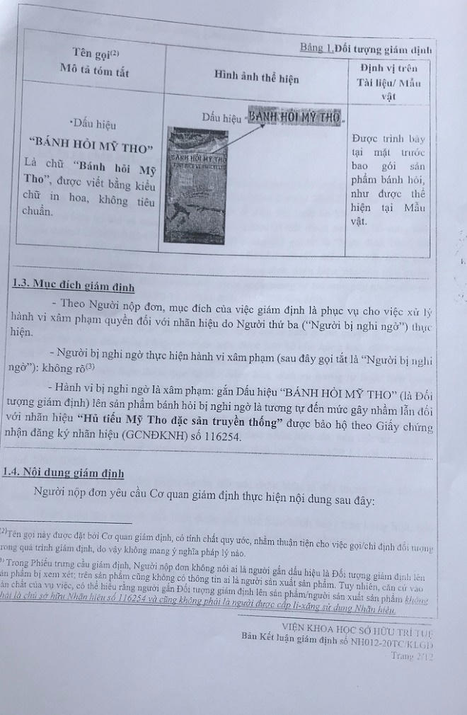 Ngày 14/1/2020, Viện KHSHTT có văn bản, nêu “Hành vi bị nghi ngờ là xâm phạm: Gắn dấu hiệu “bánh hỏi Mỹ Tho” (là đối tượng giám định) lên sản phẩm bánh hỏi bị nghi ngờ là tương tự đến mức gây nhầm lẫn với nhãn hiệu “Hủ tiếu Mỹ Tho truyền thống” được bảo hộ theo Giấy chứng nhận đăng ký nhãn hiệu số 116254”.