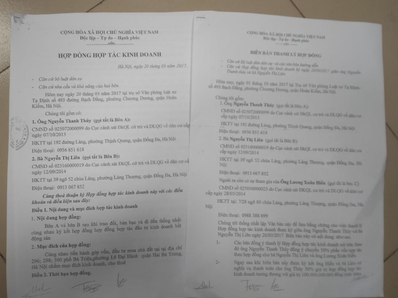 Hồ sơ vụ việc thể hiện, ông Nguyễn Thanh Thủy (ngụ phường Thịnh Quang, Đống Đa, Hà Nội) và Liên đã ký Hợp đồng hợp tác kinh doanh đề ngày 20/3/2017 với nội dung cùng nhau góp vốn, đầu tư mua nhà đất tại số 296, 298, 300 phố Bà Triệu, quận Hai Bà Trưng. Hai bên tạm tính giá trị hợp tác đầu tư là 200 tỷ đồng, mỗi bên góp 100 tỷ. Lợi nhuận sau đầu tư được chia theo tỷ lệ 50/50 (hợp đồng có LS Cao Văn Bình ký làm chứng).