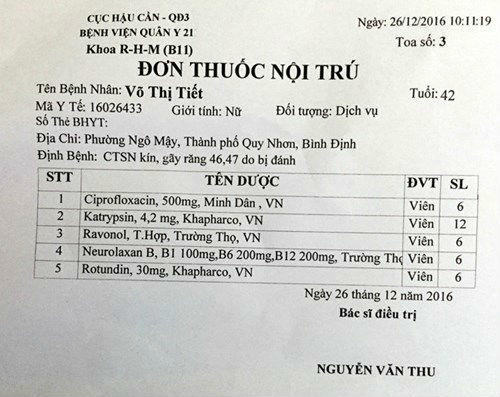 Ngoài tố cáo bị hành hung, LS Tiết còn cho rằng mình bị đánh nhưng mọi người không can thiệp. Để chứng minh LS Tiết bị gãy răng, chấn thương sọ não kín, có 02 tài liệu được ghi là Đơn thuốc nội trú và Phiếu tính tiền Đơn thuốc nội trú với giá trị thanh toán chưa tới 28.000 đồng.