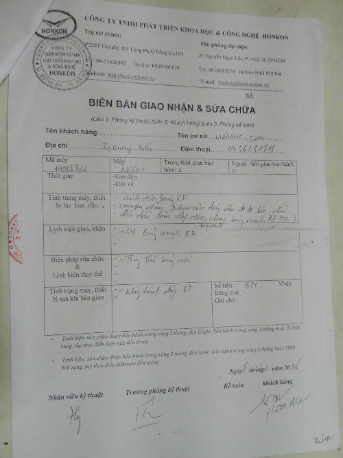 Trong “Biên bản giao nhận & sửa chữa” ký ngày 8/10/2015 mà phía công ty HonKon cung cấp cho PV có ghi nhận tình trạng máy, thiết bị máy lúc ban đầu là: “Đánh điện bảng RF”; “Nguyên nhân: Nhân viên dùng dầu để trị liệu, dẫn đến dầu làm chập điện tay cầm, cháy bảng mạch RF 750”.