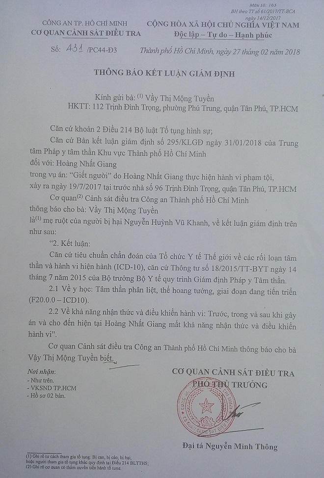 Mới đây nhất, ngày 27/2/2018, chị Tuyền nhận được thông báo của cơ quan điều tra với nội dung “Giang bị tâm thần phân liệt, mất khả năng nhận thức và điều khiển hành vi”. Kết luận nêu rõ trước, trong và sau khi gây án, Giang bị tâm thần phân liệt, thể hoang tưởng, giai đoạn đang tiến triển.