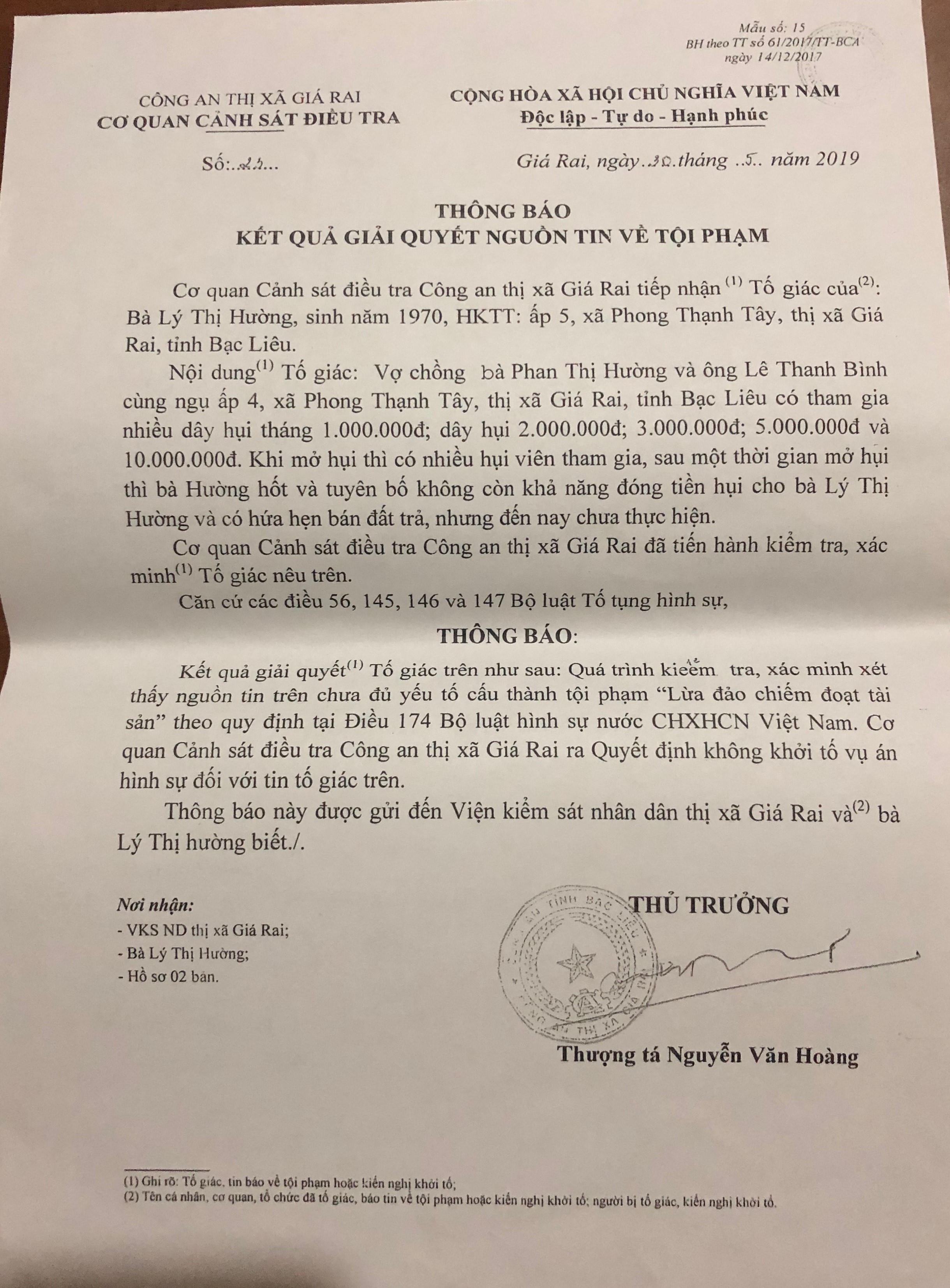 Sau hơn nửa năm tiếp nhận đơn tố giác tội phạm của bà Lý Thị Hường, ngày 30/5/2019, Cơ quan Cảnh sát điều tra Công an TX Giá Rai mới ra Thông báo không khởi tố vụ án hình sự. Thông báo này nêu: “Quá trình kiểm tra, xác minh xét thấy nguồn tin tố giác chưa đủ yếu tố cấu thành tội phạm “Lừa đảo chiếm đoạt tài sản” theo quy định tại Điều 174 Bộ luật hình sự”. Theo cơ quan này, bà Phan Thị Hường thừa nhận có chơi 3 chưng hụi nhưng không có khả năng chi trả và không trốn khỏi địa phương.
