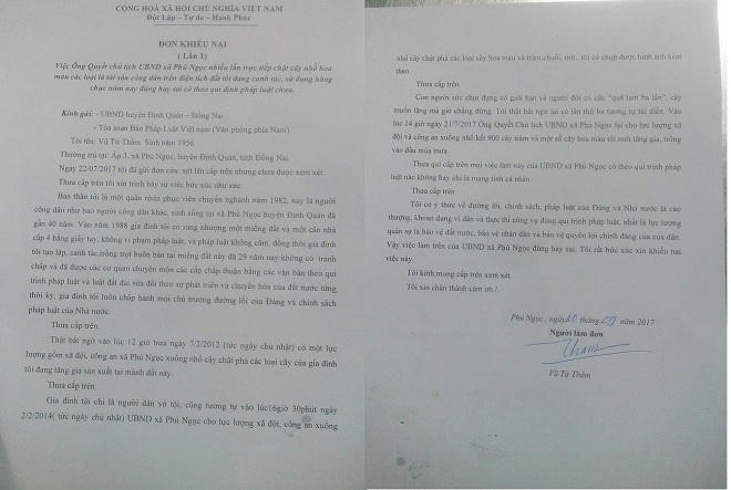 Cũng liên quan đến vụ việc trên, ông Thẩm vừa gửi đơn đến các cơ quan chức năng khiếu nại về việc Chủ tịch UBND xã Phú Ngọc nhiều lần cho người xuống chặt phá cây ăn trái và hoa màu mà gia đình ông đang tăng gia sản xuất trên mảnh đất đang được đề nghị cấp sổ đỏ làm thiệt hại, cũng như xâm hại đến tài sản gia đình ông.