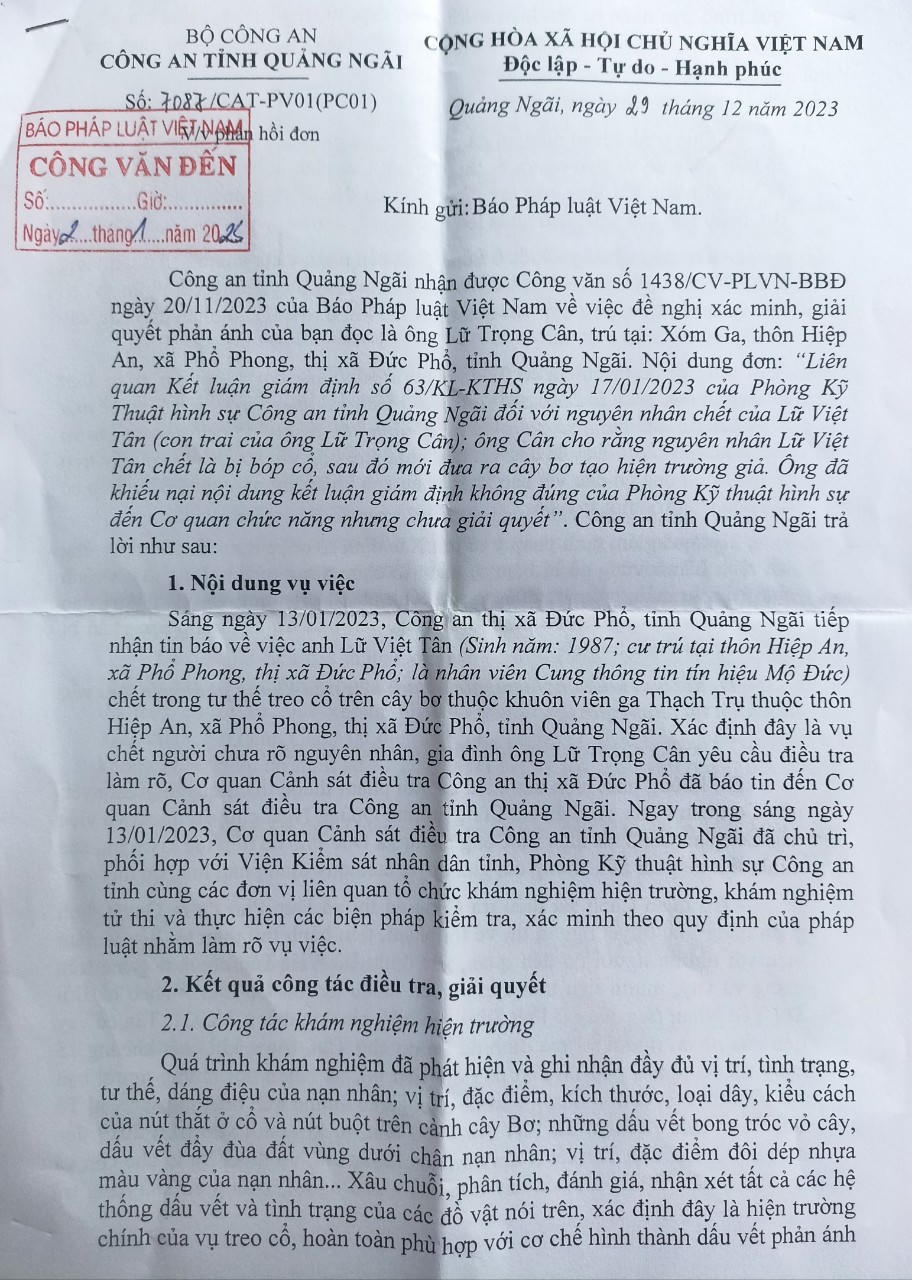 (PLVN) - Báo PLVN vừa nhận được Văn bản 7087/CAT-PV01(PC01) của Công an tỉnh Quảng Ngãi trả lời đơn của ông Lữ Trọng Cân (ngụ xóm Ga, thôn Hiệp An, xã Phổ Phong, TX Đức Phổ) do Báo PLVN chuyển đến.