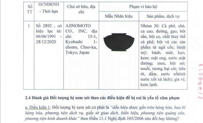 Kết luận giám định sở hữu công nghiệp ngày 28/7/2015 của Viện Khoa học sở hữu trí tuệ (viết tắt VKHSHTT), dấu hiệu “3 chữ tượng hình” gắn trên sản phẩm mì chính của Công ty Hà Trung Hậu có yếu tố xâm phạm quyền đối với nhãn hiệu “3 chữ tượng hình” được bảo hộ theo giấy chứng nhận đăng ký nhãn hiệu số 169 của AJI-NO-MOTO CO., INC.