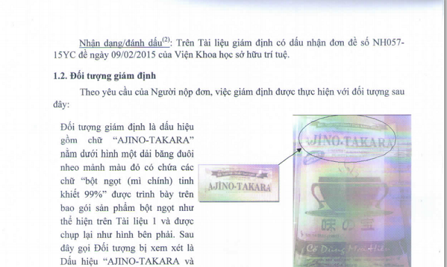 Công ty Hà Trung Hậu dẫn chứng, tại kết luận giám định về SHCN số: NH057-15YC/KLGĐ của Viện KHSHTT ngày 26/02/2015 (do Công ty Hà Trung Hậu yêu cầu giám định) có nêu: Không đủ căn cứ để kết luận dấu hiệu “AJINO-TAKARA và hình” gắn trên sản phẩm bột ngọt/mì chính như được thể hiện trên tài lệu giám định là yếu tố xâm phạm quyền (quy định tại Đ.11 NĐ 105/2006 sửa đổi) đối với nhãn hiệu “AJI-NO-MOTO và hình” được bảo hộ theo giấy chứng nhận đăng ký nhãn hiệu số 163188 của AJINOMOTO Co.;inc". (Ngược lại với KL1 và KL2 của VKHSHTT).