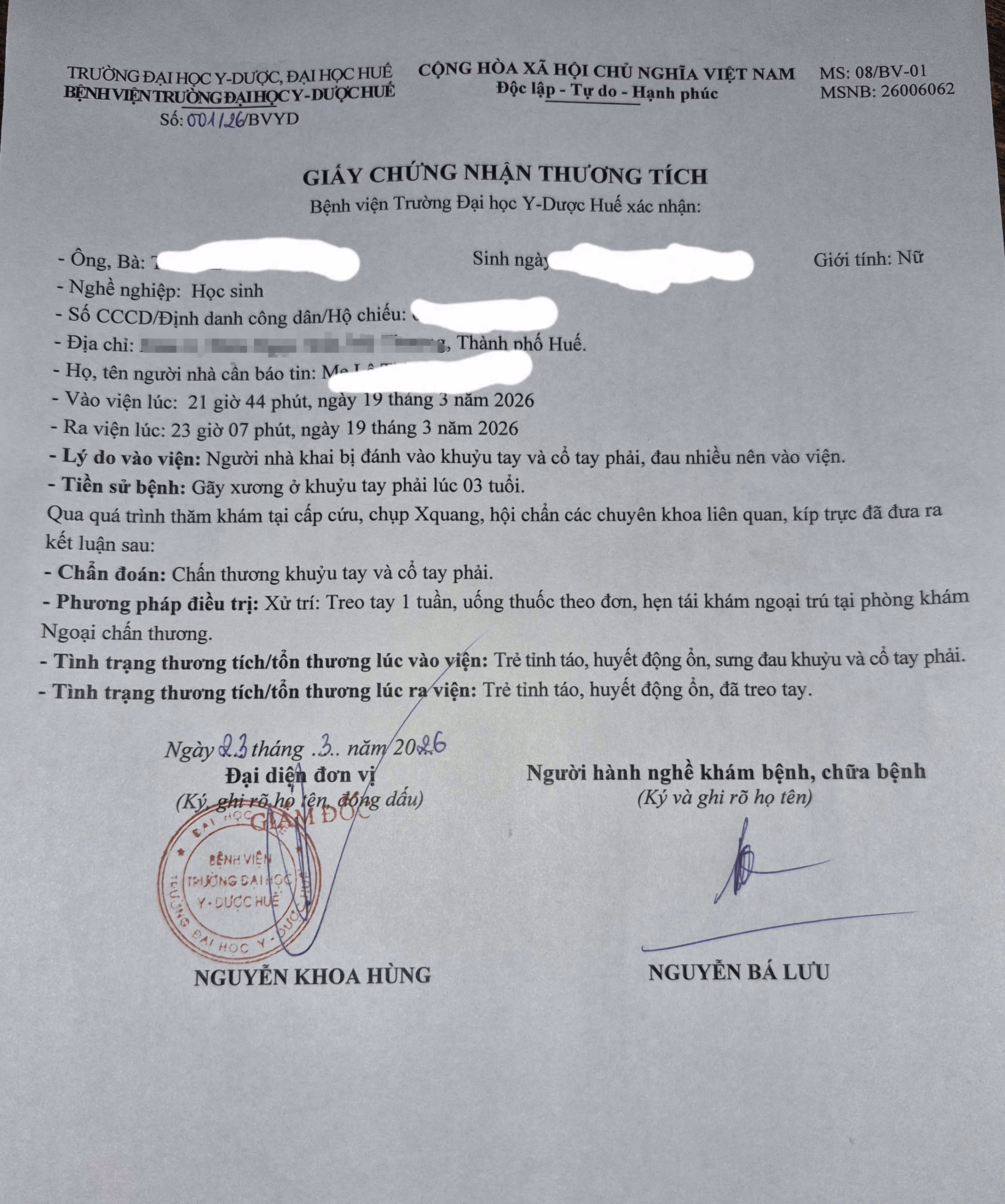 Giấy chứng nhận thương tích do Bệnh viện Trường Đại học Y Dược Huế cấp ngày 23/3 nêu rõ, qua quá trình thăm khám tại cấp cứu, chụp X-quang và hội chẩn các chuyên khoa; kíp trực đã đưa ra kết luận “chấn thương khuỷu tay và cổ tay phải”.