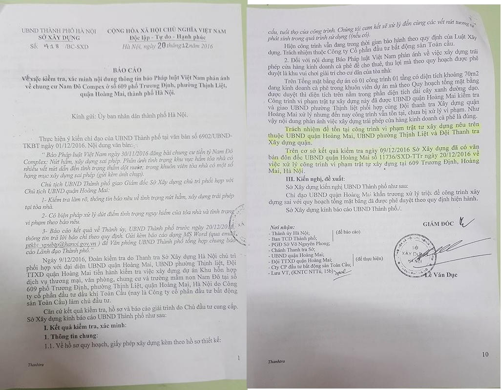Sau khi nghiên cứu các kết quả kiểm tra, hồ sơ và báo cáo giải trình do Chủ đầu tư cung cấp, Sở Xây dựng xác nhận thông tin Báo Pháp luật Việt Nam phản ánh về việc hầm để xe bị nứt và quán cà phề xây dựng sai phép tại Chung cư Nam Đô Complex là có căn cứ và đúng sự thật.
