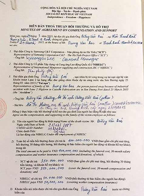 Được biết, bên cạnh số tiền hỗ trợ 400 triệu từ các công ty Sam sung C&T Việt Nam, công ty Nibelc và công ty bảo hiểm đã công bố hôm qua (29/3), đến thời điểm này mỗi gia đình có người thiệt mạng sẽ được nhận tổng cộng 460 triệu đồng.
