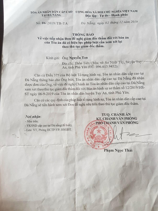 Thế nhưng, ý kiến của Ton bị tòa bác bỏ. Do không đồng ý với bản án, gia đình Ton đã kháng cáo lên TAND tỉnh Phú Yên.