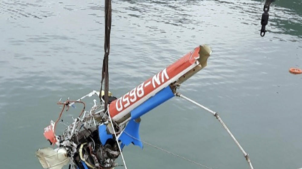 Một phần máy bay Bell-505 số hiệu VN-8650 gặp nạn, được Hải quân vớt lên trưa 6/4. |