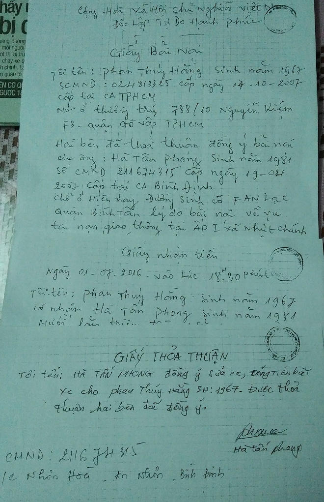 | Giấy tờ chứng minh ông Phong là người gây tai nạn nên mới bồi thường cho bà Hằng và được viết giấy bãi nại |