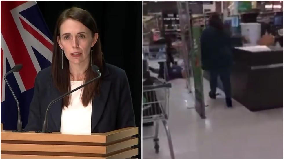 Thủ tướng New Zealand trong cuộc họp báo và hình ảnh vụ tấn công tại siêu thị New Lynn Countdown ở Auckland được bà gọi là "một hành động khủng bố". |