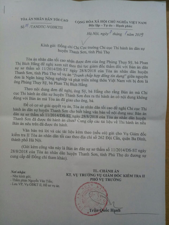 (PLVN) - TAND Tối cao vừa có văn bản gửi Chi cục trưởng Chi cục THADS huyện Thanh Sơn, tỉnh Phú Thọ sau khi nhận được đơn của vợ chồng bà Phan Thị Bích Hằng (trú tại khu Tân Hương, xã Hương Cần, huyện Thanh Sơn, tỉnh Phú Thọ).