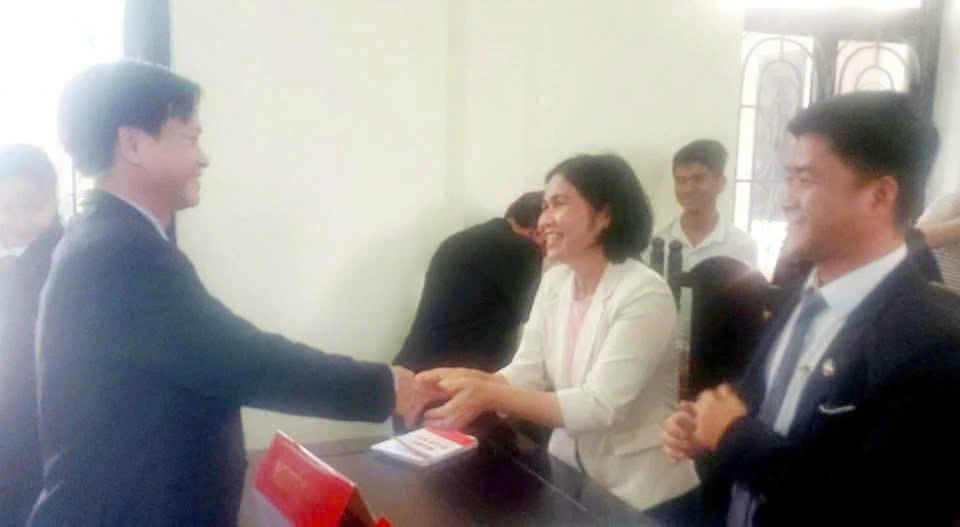 Nguyên đơn và bị đơn vui vẻ bắt tay nhau sau phán quyết của TAND thị xã Hương Thủy sáng 25/3. |