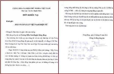 “Hiệu trưởng đã lợi dụng quyền hạn, hợp đồng với công ty có giá thực phẩm cao để trục lợi cá nhân, làm ảnh hưởng đến sức khỏe của các cháu. Nếu hiệu trưởng chịu hợp đồng thực phẩm giá bằng thị trường thì tiền ăn mỗi ngày của các cháu dư ra là không nhỏ”, theo đơn trình bày của tập thể giáo viên.