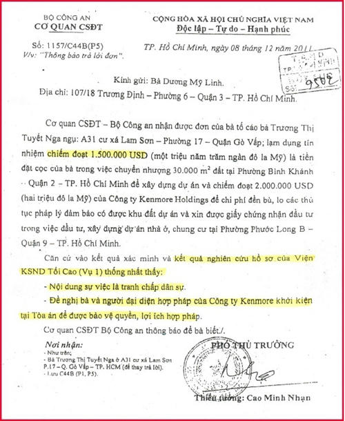 Đáng nói hơn, trước khi vụ án được khởi tố hơn 1 năm thì Cơ quan CSĐT Bộ Công an đã từng có văn bản trả lời đơn tố cáo của bà Linh với nội dung “Cơ quan CSĐT- Bộ Công an nhận được đơn tố cáo bà Trương Thị Tuyết Nga lạm dụng tín nhiệm chiếm đoạt 1.500.000 USD là tiền đặt cọc của bà trong việc chuyển nhượng 30.000m2 đất tại phường Bình Khánh, quận 2, TP HCM để xây dựng dự án và chiếm đoạt 2.000.000 USD của Cty Kenmore Holdings để chi phí đền bù, lo các thủ tục pháp lý đảm bảo có được khu đất dự án và xin được giấy chứng nhận đầu tư trong việc đầu tư, xây dựng dự án nhà ở, chung cư tại phường Phước Long B, quận 9, TP HCM.