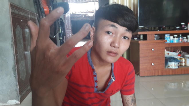 Bị hại Nguyễn Thái Thanh trong vụ án truy sát có tổ chức bị xâm hại nghiêm trọng đến sức khỏe và tinh thần. Hiện một bàn tay của anh đã mất đi ngón số 3. |