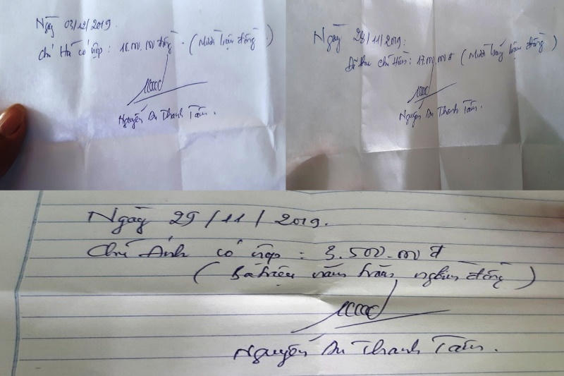 Ngày 28/11, ông Nguyễn Văn Hiền (Trưởng thôn Lại Ân) nộp 17 triệu; ngày hôm sau, ông Phạm Ngọc Ánh (đại diện 5 hộ ở thôn Thanh Vinh) nộp 3,5 triệu; ngày 3/12, ông Nguyễn Hóa (Trưởng thôn Thanh Vinh) nộp 10 triệu. Các nhân chứng đều cung cấp giấy nộp tiền được viết trên mảnh giấy nhỏ không ghi nội dung thu tiền mà chỉ ghi tên người nộp, số tiền cùng chữ ký của ông Tâm.