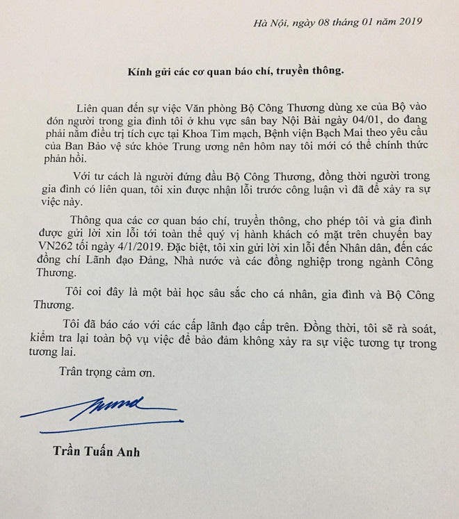 Thông tin thư xin lỗi của ông Trần Tuấn Anh được đăng tải trên Cổng thông tin Bộ Công Thương nội dung như sau: “Kính gửi các cơ quan báo chí, truyền thông. Liên quan đến sự việc Văn phòng Bộ Công Thương dùng xe của Bộ vào đón người trong gia đình tôi ở khu vực sân bay Nội Bài ngày 4/1, do đang phải nằm điều trị tích cực tại Khoa tim mạch, Bệnh viện Bạch Mai theo yêu cầu của Ban Bảo vệ sức khỏe Trung ương nên hôm nay tôi mới có thể chính thức phản hồi.