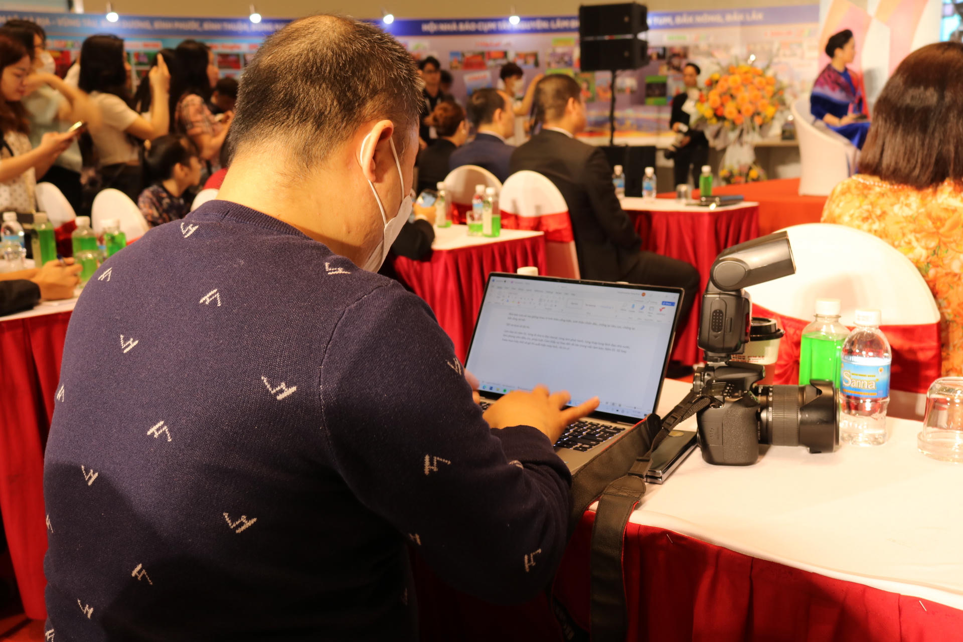 “Người làm báo” vừa chụp ảnh, vừa viết tin và đăng bài nhanh chóng. (Ảnh: Thúy Hiền) |