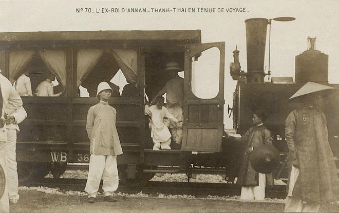 | Cựu hoàng Thành Thái cùng gia đình và đoàn tùy tùng trên đường rời kinh đô Huế sau khi bị phế truất. |