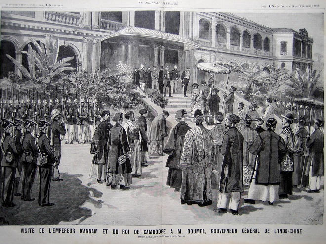 | Trong ảnh là cảnh lễ đón vua Thành Thái tại dinh Toàn quyền Norodom (Sài Gòn), tranh khắc in trên báo Pháp số ra ngày 19/12/1897 |