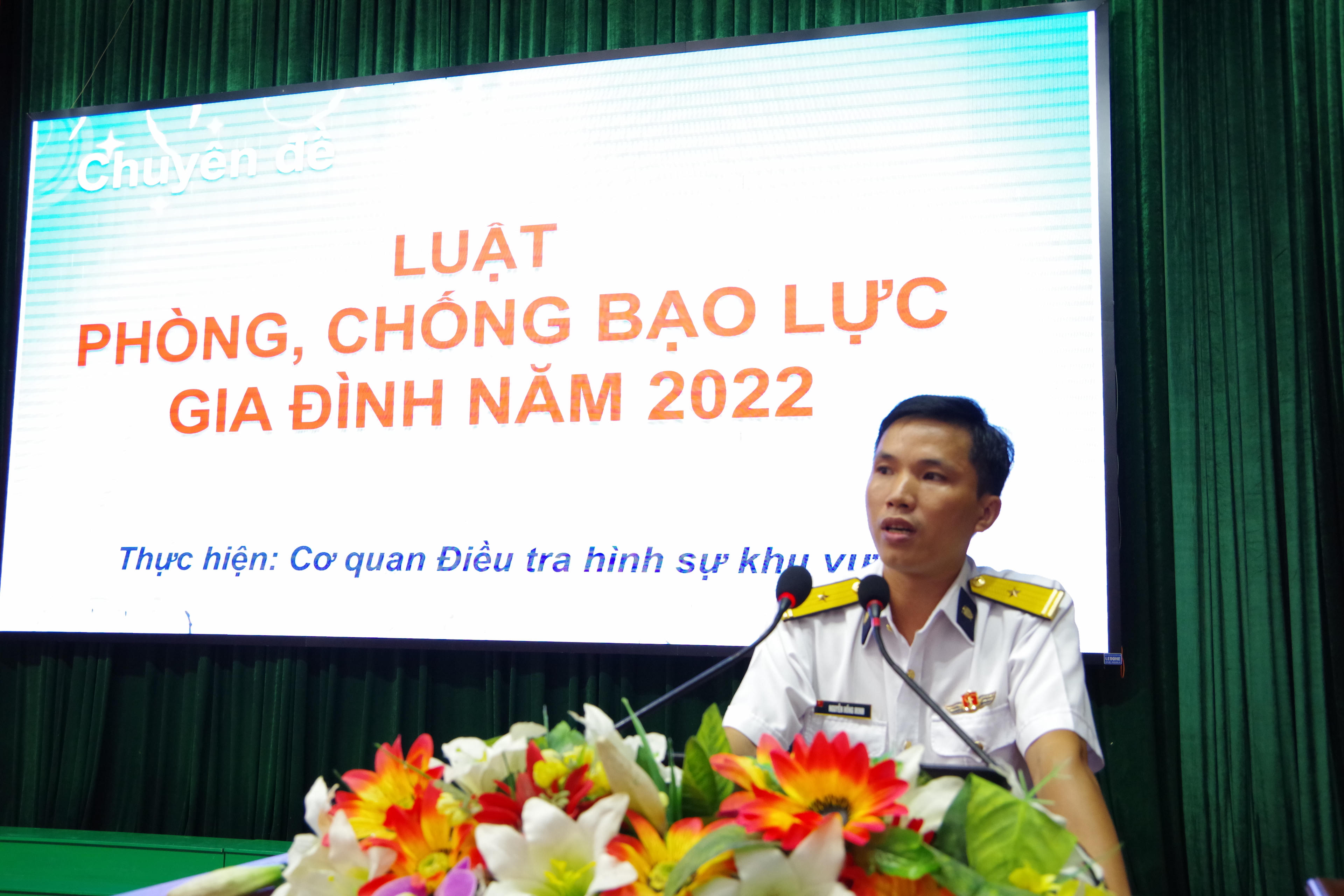 Các báo cáo viên của Cơ quan Điều tra Hình sự khu vực 3 và Viện Kiểm sát Khu vực 2 phổ biến các chuyên đề: Nội dung cơ bản của luật Phòng, chống bạo lực gia đình năm 2022; Nội dung cơ bản của luật Thực hiện dân chủ ở cơ sở năm 2022 và quy định của bộ quốc phòng về thực hiện dân chủ ở cơ sở; Tình hình vi phạm, tội phạm trong Quân đội, Quân chủng năm 2022, các giải pháp phòng ngừa.