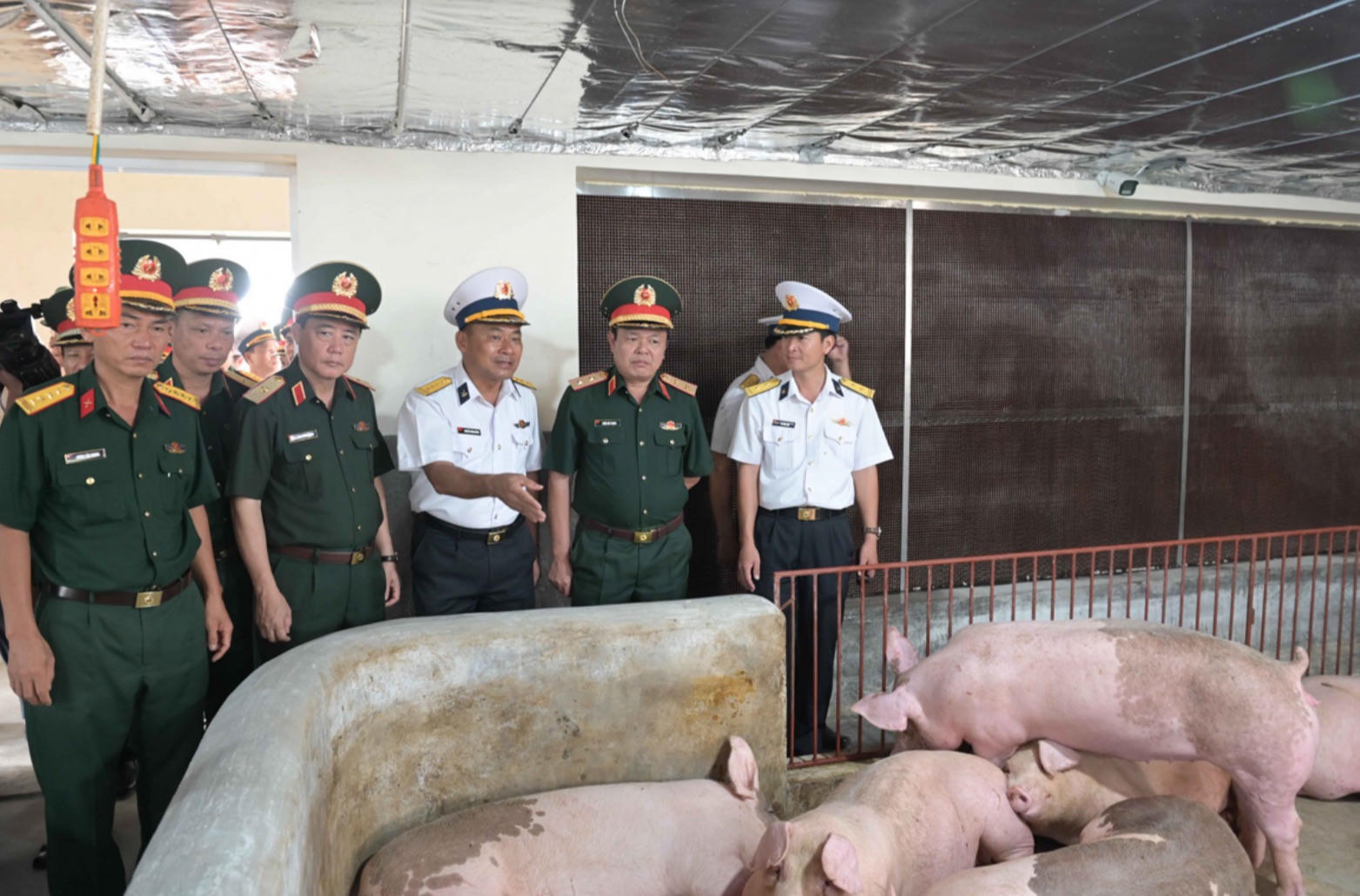 Lãnh đạo Tổng cục Hậu cần kiểm tra một khu vực nuôi lợn tại Vùng 4 HQ. (Ảnh trong bài: Nguyễn Toàn). |