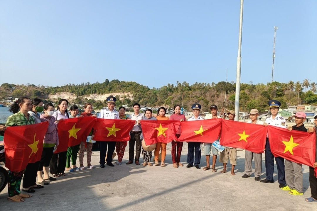 Đoàn công tác Bộ tư lệnh Vùng Cảnh sát biển 4 tặng Cờ Tổ quốc bà con ngư dân xã Nam Du, huyện Kiên Hải, tỉnh Kiên Giang. |