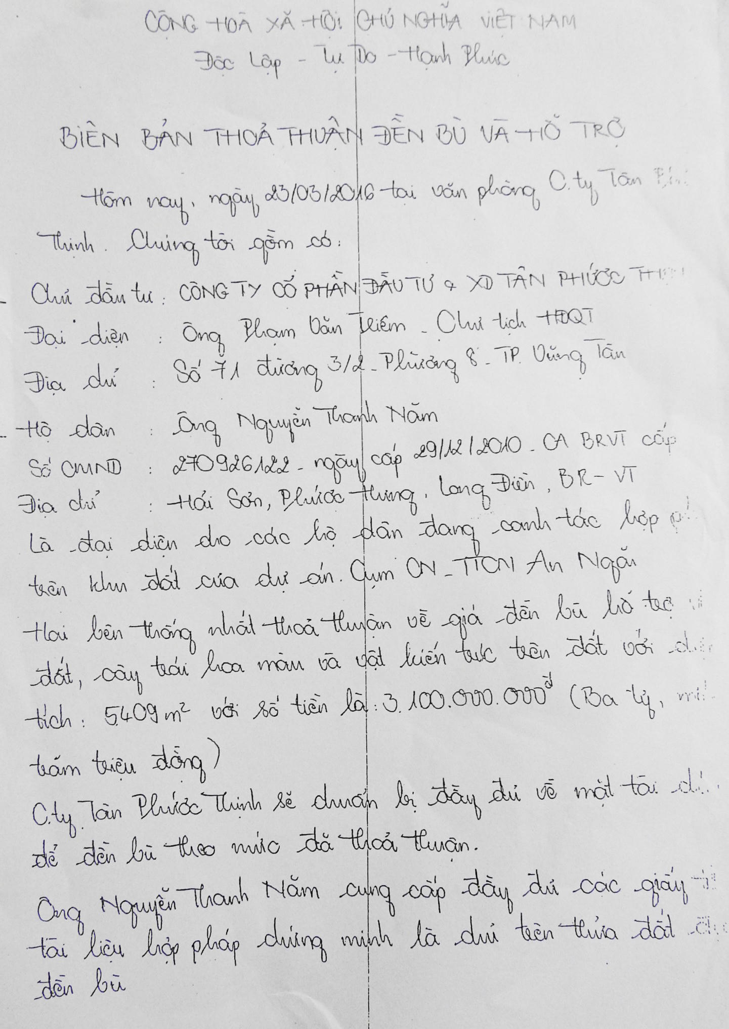 Ngày 23/3/2016, ông Phạm Văn Triêm, Chủ tịch HĐQT Công ty Tân Phước Thịnh đã lập biên bản thỏa thuận bồi thường và hỗ trợ 3,1 tỉ đồng để 5 hộ dân bàn giao mặt bằng. Ông Năm đồng ý nhưng 4 hộ còn lại thì không. Khoảng nửa tháng sau, phía Tân Phước Thịnh đồng ý chi cho 5 hộ dân số tiền 3,5 tỉ đồng nhưng sau đó lại không thực hiện.