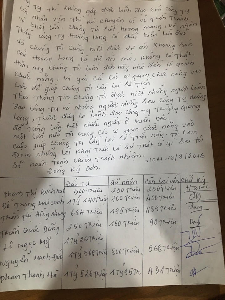 Trong thời gian gần đây, xuất hiện nhiều công ty tự xây dựng dự án “ma” để giăng bẫy người dân đóng tiền hưởng lãi rồi sau đó tính bài “cao chạy xa bay” đã và đang xảy ra ở nhiều địa phương luôn là chủ đề gây nóng gây bức xúc trong dư luận xã hội. Đó là một vấn nạn gây ra nhiều hệ lụy, hơn lúc nào hết những người dân luôn cần có sự cảnh giác để tránh rơi vào nghịch cảnh vì hám lợi mà trắng tay. Trước đơn thư phản ánh của người dân về việc Công ty Hoàng Long huy động vốn và trả thưởng theo hình thức đa cấp đồng thời có dấu hiệu lừa đảo, báo Pháp luật Việt Nam yêu cầu các cơ quan chức năng vào cuộc xử sai phạm của công ty này theo luật định.