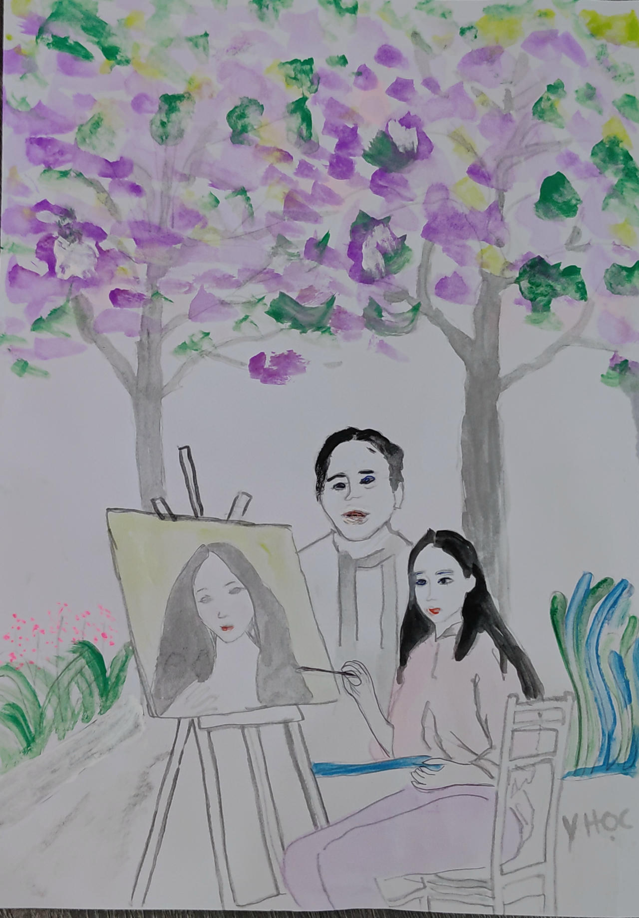 Bát mỳ làm tôi ấm bụng trở lại, người đỡ mệt hơn. Sau khi uống cốc nước ấm, tôi bị thu hút bởi những tiếng chim lích chích ngoài sân. Một cảnh tượng chưa từng có diễn ra trước mắt tôi. Bố đặt phông tranh ngay dưới tán khế và say sưa vẽ khi bầy chim nhỏ ríu rít múa quanh. Dáng bố nhỏ gầy nhưng hiền. Hình như đó là bức tranh bố đã vẽ nhiều năm mà chưa hoàn thành, ba nhân vật là ba người trong gia đình tôi dưới vòm hoa khế tím. Tôi tiến lại gần và ngồi xuống bên cạnh. Bầy chim không bay đi mà dạn dĩ vây quanh cả tôi nữa. Bố bảo: “Bố yêu chim chóc thiên nhiên từ khi ở chiến trường, những con chim bé nhỏ vui múa trên đường hành quân, những lúc nghỉ, chim đậu trên nòng súng, trên mâm pháo… Bố cũng đã tự bó hẹp mình nhiều năm. Giờ bố sẽ cởi bỏ nhiều thứ, không thể giày vò mình, giày vò cả những sắc tranh…”.